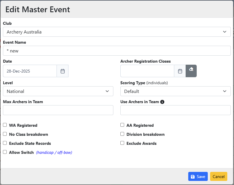AA Registered: Tick the box if the event is registered with Australian Archery