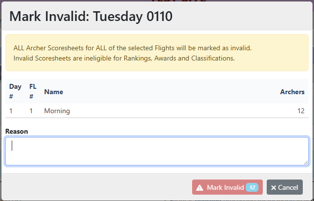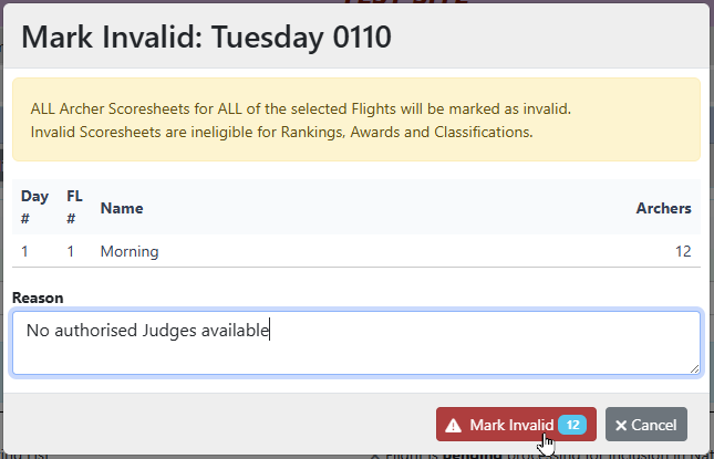 The [Mark Invalid] button will show the total number of Scoresheets that will be affected.