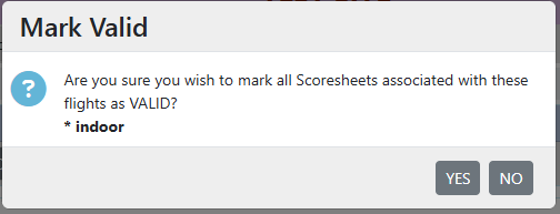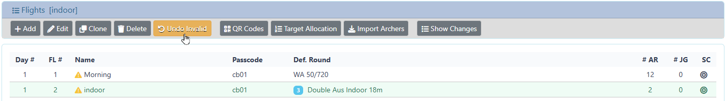 To mark all of the Scoresheets in a Flight as Valid, select one or more Flights from the Flight list page, and click the Undo Invalid button.